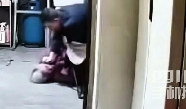 他将站在灶台旁的老人一把推倒,揪着头发按在地上又打了数下。