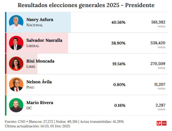 洪都拉斯自由党候选人萨尔瓦多·纳斯拉亚以38.9%的得票率紧随其后,执政党自由与重建党候选人丽克西·蒙卡达以19.54%的得票率排在第三。