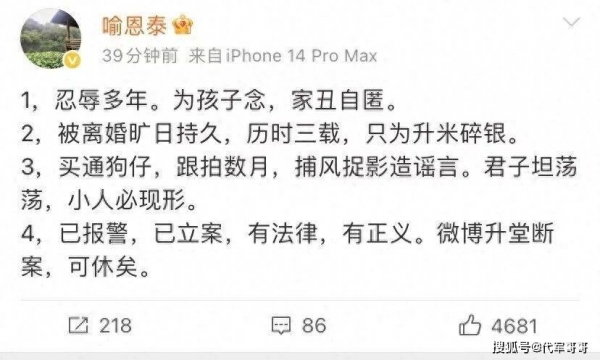 2025 年 11 月 19 日深夜,喻恩泰在社交媒体上发布的四点声明,犹如一颗重磅炸弹,瞬间在网络上掀起了惊涛骇浪。这份声明,不仅是他对这场持续三年的离婚风波的首次正面回应,更是他试图打破外界误解、还原事实真相的有力尝试。