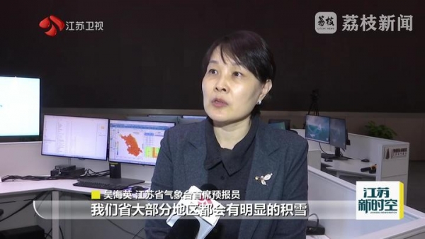 江苏省气象台首席预报员吴海英说:"1月19日这一天应该是雨雪的最强时段,在江苏的江淮之间,北部到淮北这一带会出现大雪、局部暴雪,其他大部分地区会有中到大雪。整个降雪的过程,预计在20日的白天基本上结束了。降雪天气过后,江苏大部分地区都会有明显的积雪,特别是在江苏的西北部,可能有5厘米以上的积雪深度。"