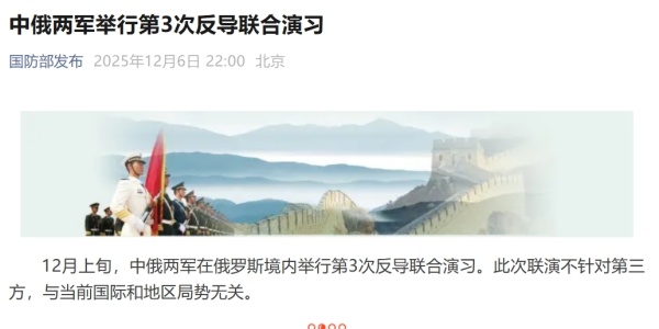 微信公众号"国防部发布"消息,12月上旬,中俄两军在俄罗斯境内举行第3次反导联合演习。此次联演不针对第三方,与当前国际和地区局势无关。