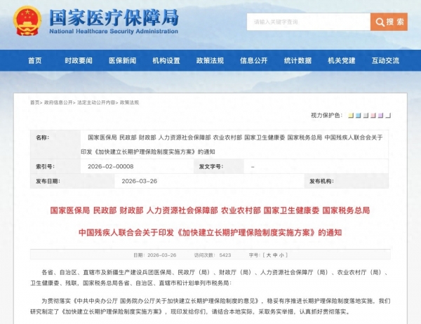 3月26日,国家医保局联合民政部、财政部等8部门印发《加快建立长期护理保险制度实施方案》,要求到2028年年底,长期护理保险制度在全国范围基本实现全覆盖。