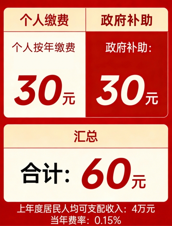 假设某地上年度居民人均可支配收入为4万元,在制度实施的当年费率按0.15%计算,那么按年缴费为60元,由个人缴费和政府补助按1:1构成,即各承担30元。