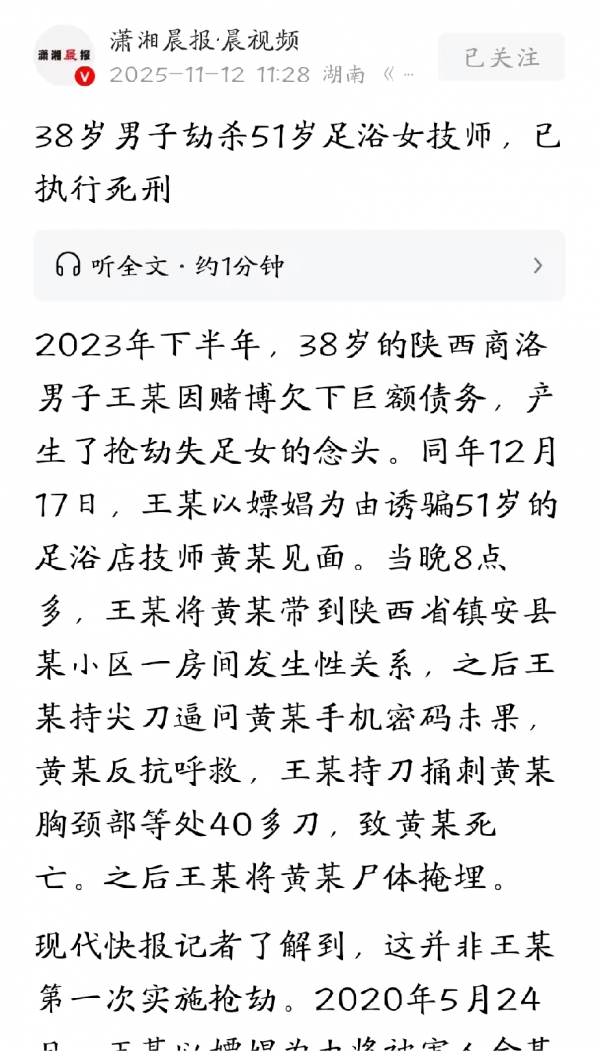 陕西商洛,38岁男子沉迷赌博,并欠下巨额债务,为了还钱,他以嫖 娼为由,约51岁足浴店女技师见面,将她带到一处偏僻房间,发生了关系。完事后,他掏出一把尖刀抵着女技师胸膛,让她说出手机密码,女技师没有乖乖就范,拼命反抗叫喊。男子被激怒,将刀重重刺进女子胸部颈部40多次,女子死亡后,为了掩盖罪行,他还将尸体掩埋。男子的恶行很快被发现,法院的判决大快人心。