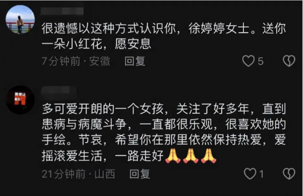 她开始迷迷糊糊地躺在床上休息着,忍受着疼痛的折磨。看着她蜷缩在病床上无助的样子真的让人很心疼。就在大家期待着她的更新时,却传来了她离世的消息。或许对于徐婷婷来说,离开是一种解脱吧!她不用再忍受病痛的折磨了!