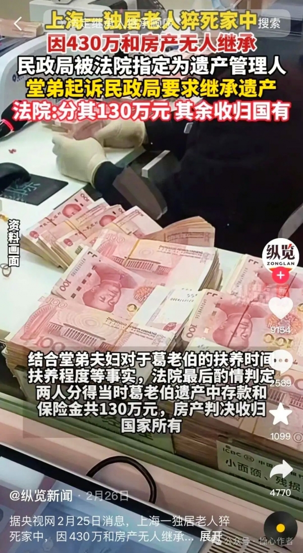 上海徐汇区的一位独居老人2022年过世,他生前留下的存款和保险金共计约130万元。除此之外,老人名下还有另外一笔300万元的款,另有一套房子位于上海市区。由于这位老人没有子女,第二顺序继承人也过世了,他生前也没有留下遗嘱,所以,按照法律规定,他所属的徐汇区民政局成为其遗产管理人。