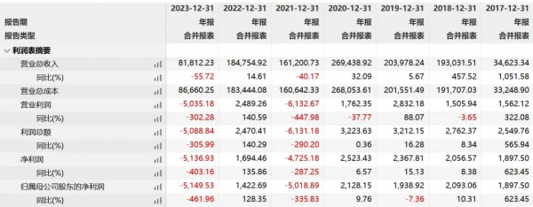 2021年和2022年,庚星股份营业收入分别为16.12亿元和18.48亿元,同比分别下降40.17%、增长14.61%;净利润分别为-4275万元和1694万元,同比分别下降287%、增长135%;然而2023年业绩又出现"双降"。全年实现营收8.18亿元,同比下降55.72%;净亏损约为-5136.93万元,同比大降403.16%,由盈转亏。