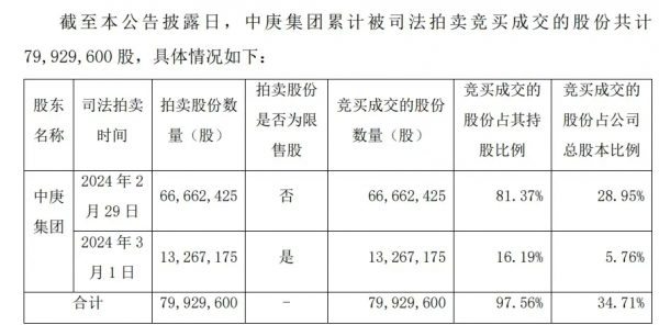 最终,中庚集团累计被司法拍卖竞买共计7992.96万股,占其所持公司股份的97.56%,占公司总股本的34.71%。
