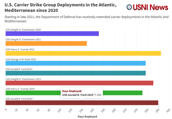 2021年后,美国航母超过200天的超长部署成为常态,而"福特"号此次则已经到达了280天USNI新闻网