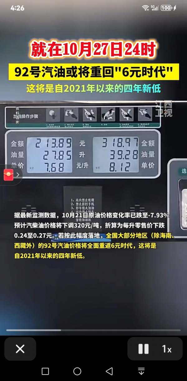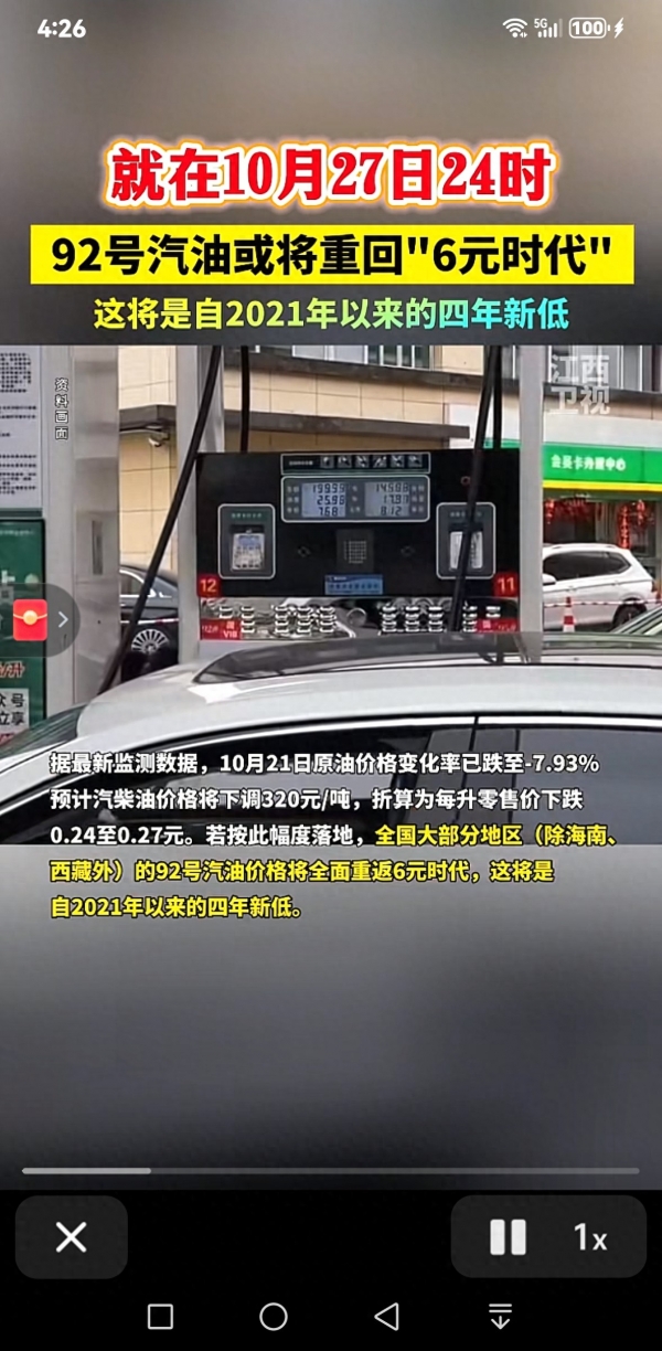 各位司机朋友们,告诉你们一个好消息!就在2025年10月27日24时,咱们常用的92号汽油可能要重回"6元时代"啦,这可是自2021年以来的四年新低哦!