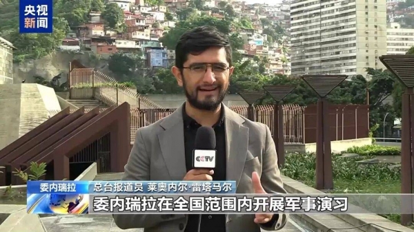 总台报道员 莱奥内尔·雷塔马尔:委内瑞拉在全国范围内开展军事演习,激活其防御系统,同时举行宣示和平立场的会议以凝聚社会各界的力量,共同捍卫和平与主权。