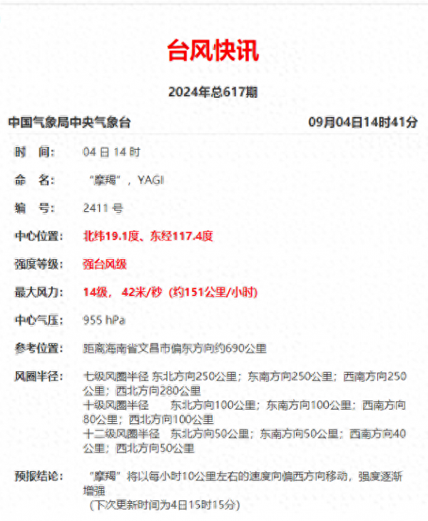9月4日10时,海口交通港航局发布温馨提示:受今年第11号台风"摩羯"影响,大部分滚装船舶已在9月3日18时至4日0时期间分批离开港口前往广东珠江口水域防风。海口新海港已于9月4日0时起停运,秀英港和铁路南港将于9月4日24时起停运。后续复运时间视气象情况而定。