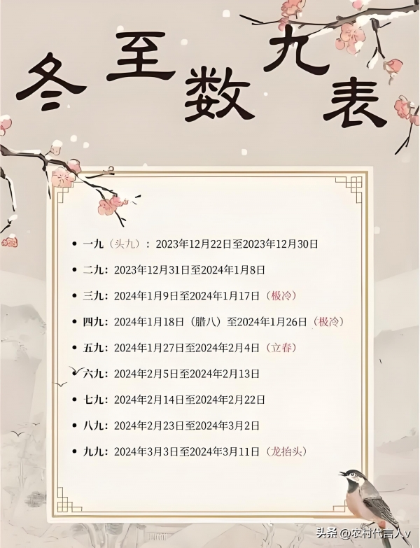 现代简法:冬至当天入九。这是现在最常用的方式,简单好记,日历上也大多这么标注。2025年冬至是12月21日(农历十一月初二),按这个算法,一九就从这天开始,出九时间是2026年3月11日。