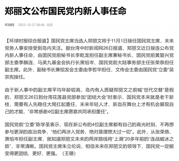 观察岛内政局的最新演进,不得不说,台岛正站在历史十字路口的关键时刻,蓝营新主席郑丽文的上位,确实堪称历史留给国民党的最后一个机会。