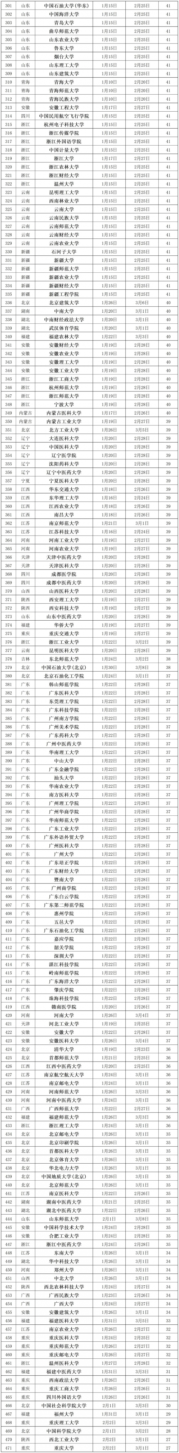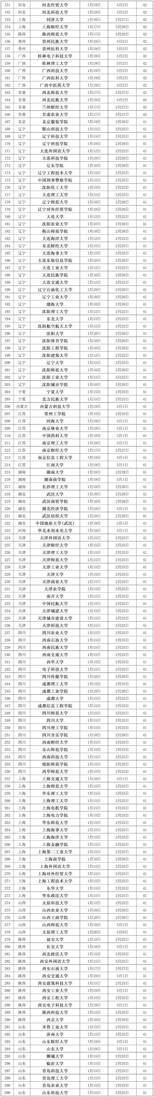 我们观察到,各大院校的寒假放假时间普遍从1月10日-15日开始,至2月28日左右结束,基本持续时间为40天-43天。