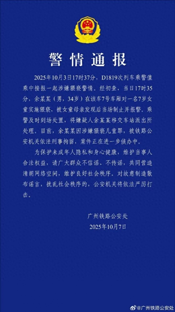 广州铁路公安10月7日通报,10月3日17时37分,D1819次列车乘警值乘中接报一起涉嫌猥亵警情。经初查,当日17时35分,余某某(男,34岁)在该车7号车厢对一名7岁女童实施猥亵,被女童母亲发现后当场制止并报警。乘警及时到场处置,将嫌疑人余某某移交车站派出所处理。目前,余某某因涉嫌猥亵儿童罪,被铁路公安机关依法刑事拘留,案件正在进一步侦办中。