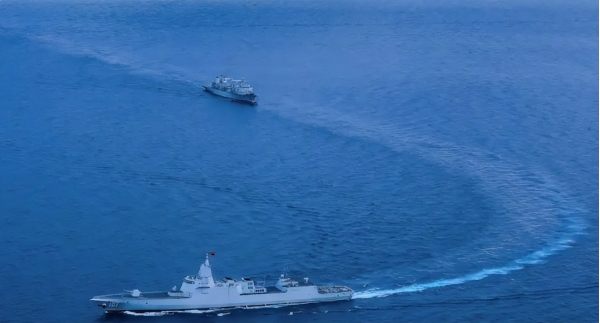 这是中国海军的大型载机平台首次不再局限于近海或传统航线,而是以前所未有的姿态切入太平洋腹地。紧随其后为其撑起防空保护伞的,是一艘万吨级的055型大型驱逐舰,澳洲代号"刃海"级。