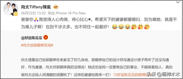 也有网友表示,郭碧婷作为豪门儿媳也得到不少好处,比如向太给郭碧婷在老家买了好几块地盖房子,还发文大谈"婆媳经",称"希望天下的婆婆都爱媳妇,别为难她,就是不为难儿子"。