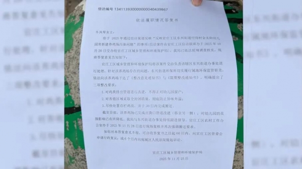 问题没有解决,牛女士又把问题反映到了河南省信访办。11月25日,南阳市官庄工区城乡管理和环境保护局出具了一份答复书,上面显示,官庄工区城乡管理和环境保护局将该案件交由负责该辖区东兴街道办事处进行处理,并对养鸡场明确提出了三项整改要求:对鸡粪排出管道进行改建,不得正对幼儿园窗户;对养殖区域采取全封闭措施,彻底防止异味外溢;尽快处置存栏鸡苗,并于30日内完成搬迁。