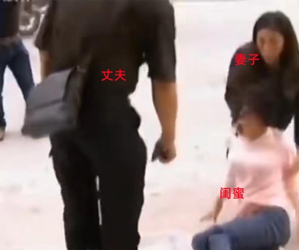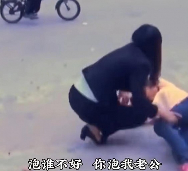 画面中穿着黑衣服的女子是阿云(化名),而被阿云摁在地上拳打脚踢的女人是王燕飞(化名),就在阿云殴打王燕飞的时候他的丈夫石东全(化名)曾试图过来阻止,结果被阿云一声怒喝,直接吓得乖乖退到了一旁。