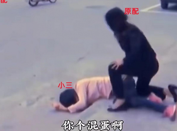 面对妻子的威胁,石东全赶紧退到了后面,任由两个女人在地上扭打成一团。