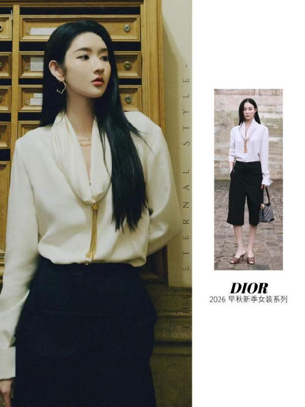 上身白色的垂感衬衫 是慵懒的优雅基石,衬衫采取细腻光泽的垂感面料,是高级感的无声宣言。宽松而不垮塌的剪裁,营造出一种 effortless 的松弛美,这正是当下"静奢风"的核心。而领口的抓褶设计与金色流苏饰带是整套 look 的点睛之笔。