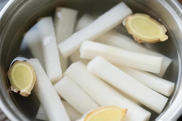 1. 白萝卜、生姜洗净后放入锅中,加水;