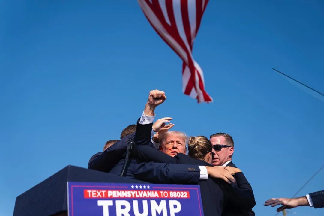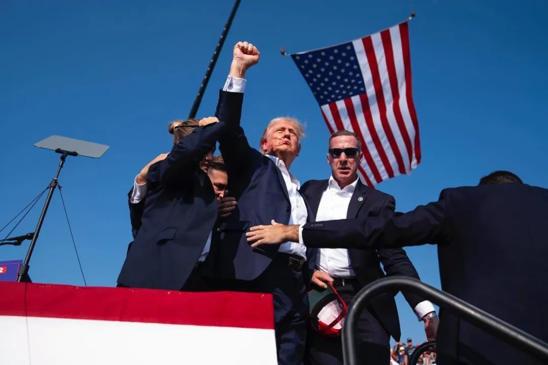 当地时间7月13日晚,美国前总统特朗普在宾夕法尼亚州巴特勒市的竞选集会上,遭枪手袭击,耳部受伤,来自盖蒂图片社的ANNA MONEYMAKER拍摄下这张经典的现场照片: