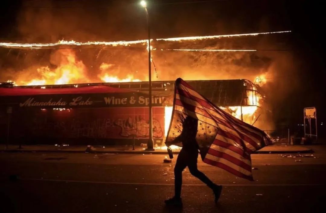 2020 年 5 月 31 日,示威者在抗议乔治·弗洛伊德 (George Floyd) 之死时掀翻了一辆汽车,乔治·弗洛伊德 (George Floyd) 在被明尼阿波利斯警察制服后死亡。
