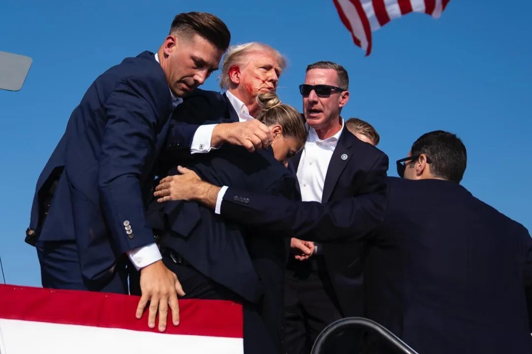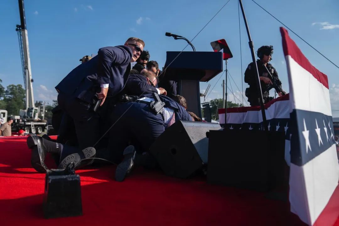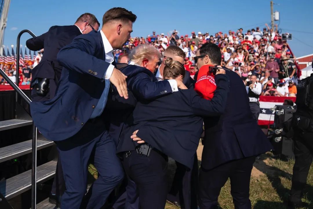 周六,前总统唐纳德·特朗普在宾夕法尼亚州巴特勒举行的竞选集会上被美国特勤局特工围拢保护着。(Evan Vucci/美联社)