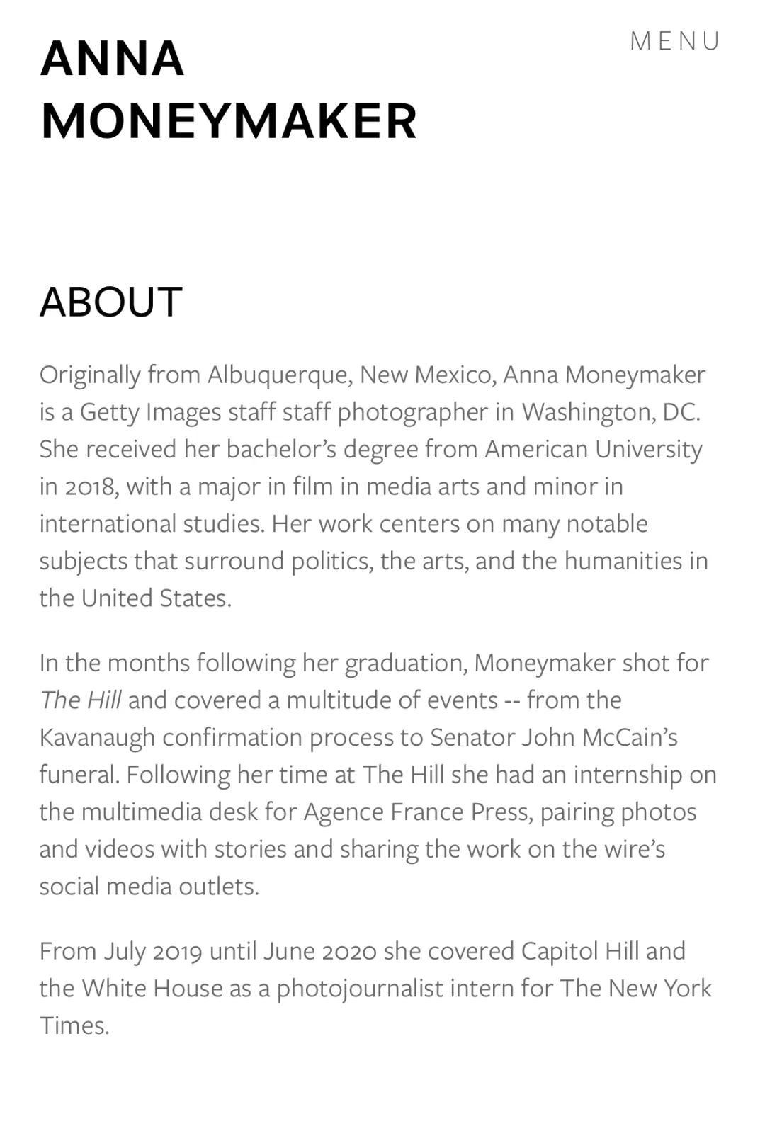 Anna Moneymaker 来自新墨西哥州阿尔伯克基,是华盛顿特区 Getty Images 的一名专职摄影师。她于2018年获得美利坚大学学士学位,主修电影媒体艺术,辅修国际研究。她的作品集中于围绕美国政治、艺术和人文的许多著名主题。