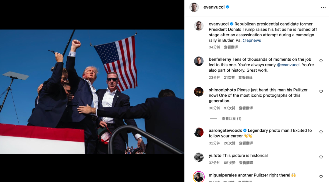 此外,摄影师 Evan Vucci 在现场记录下另一张传播更为广泛的经典作品,他在枪击发生时,决定在特朗普遇刺倒地后快速移动至讲演台正前方,并一路跟随特朗普的举动。