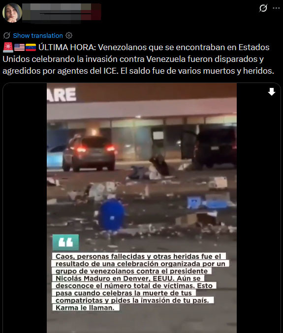 今天,有些委内瑞拉博主开始反击,指出"润人"在庆祝时被美国移民和海关执法局(ICE)冲了,ICE还开枪打死打伤多人。