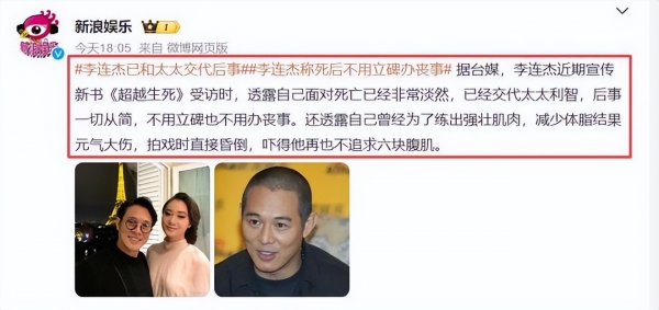 事实上,早在两年前,李连杰就向利智交代好了身后事,一切从简,不需要办丧事,也不用立碑。比如什么树葬、海葬都可以。作为一代功夫巨星,能够把自己的身后事看得如此之开,李连杰也算是第一人了,看来这么久的修行让李连杰彻底大彻大悟啦!