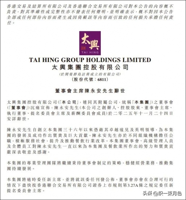 一则公告,震动餐饮江湖11月24日清晨,太兴集团官网首页悄然换上黑白色调,一则简短的讣告让无数人停下脚步:"本集团怀着沉痛心情宣布,创办人、控股股东兼董事会主席陈永安先生于11月24日凌晨安详离世,享年66岁。"
