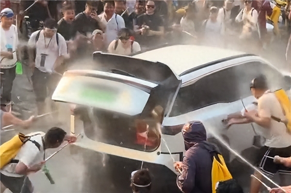 当天,一辆广汽丰田纯电SUV铂智3X经过街道时,顿时有非常多人的人冲着它泼水,期间还有人拉车门,更有人趁机打开了车辆尾门,不少人瞅准时机冲着车内浇水,甚至出现了"白烟",引发网友关注。