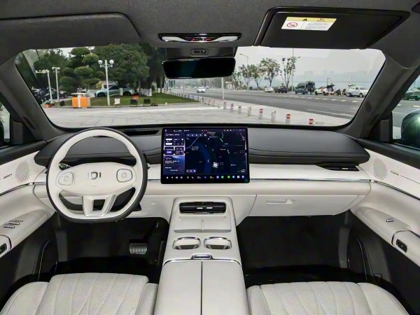 车内就是典型的新能源车风格了,整体非常简洁,最大的看点肯定是15.4英寸中控屏了,头顶上方还有12.8英寸副驾娱乐屏,整体配置可圈可点。另外,像副驾零重力座椅、后排座椅加热通风、后排小桌板、1.2平米采光面积天窗、带电动遮阳帘物理按键、CDC魔毯悬架、方向盘加热、256 色氛围灯、AR-HUD、支持外接屏幕以及全车16枚扬声器都有。