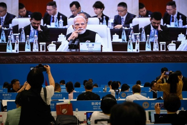 2025年9月1日,天津,上海合作组织峰会期间,媒体中心屏幕上显示印度总理莫迪出席会议。视觉中国