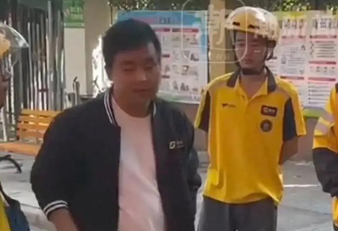 余站长手扶着这残疾小哥,对其他外卖小哥说道:"这位小伙身体有缺陷,我们是一个集体,看到他了帮他一下,我们不要歧视他,不要笑他,谁要笑他,我娄你的人(湖北方言搞人的意思),一百多号人,在路上遇见了,能帮的就帮他一下。"