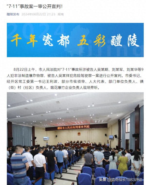 8月22日上午,湖南省醴陵市法院对"7·11"养猪场爆炸案宣判,被告人吴某期等9人非法生产狗尾草药饼,致7人死亡,被判非法制造爆炸WU罪。吴某期等10名被告分别被判处有期徒刑十四年至拘役五个月不等刑罚,得到了法律公正的裁决。