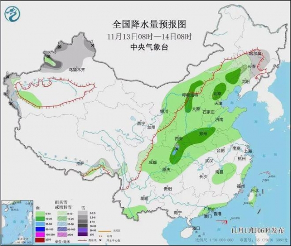 后日到了11月13号,自北向南降雨范围更加扩大了,如台湾岛南部、广东南部沿海、江西东北部、福建西北部、浙江东南部、江苏北部、安徽北部、山东大部、河南大部、湖北中西部、陕西大部、重庆大部、四川中东部、北京、天津、河北大部、山西大部、内蒙古河套地区、辽宁西部等地部分地区有小到中雨,其中,陕西南部、四川东部、重庆东北部等地部分地区有大雨。