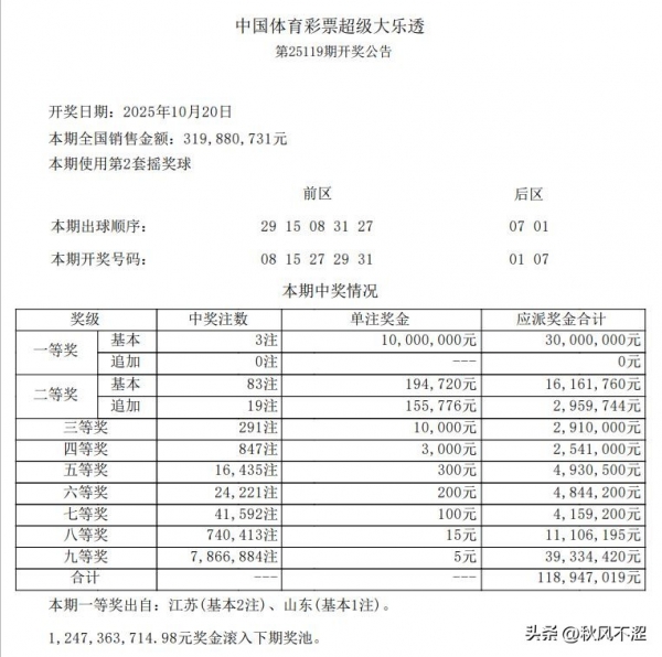 上期大乐透开出了3注一等奖,每注奖金1000万,其中江苏2注成为当期最大的赢家,二等奖83注,每注19.4万,以下是上期开奖公告: