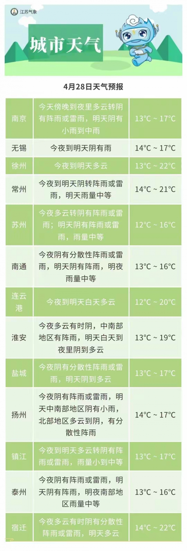 此次天气转折来得迅速。4月27日,江苏还处在暖湿气流掌控中,全省最高气温普遍达25-28℃,淮北局部接近29℃,体感偏热。但从27日夜间起,冷空气与暖湿气流交汇,自北向南拉开降水序幕。28-29日,沿江和苏南地区阴有阵雨或雷雨,苏南南部雨量中等,部分时段雨势较明显;淮北地区以多云到阴为主,局部有分散性阵雨。