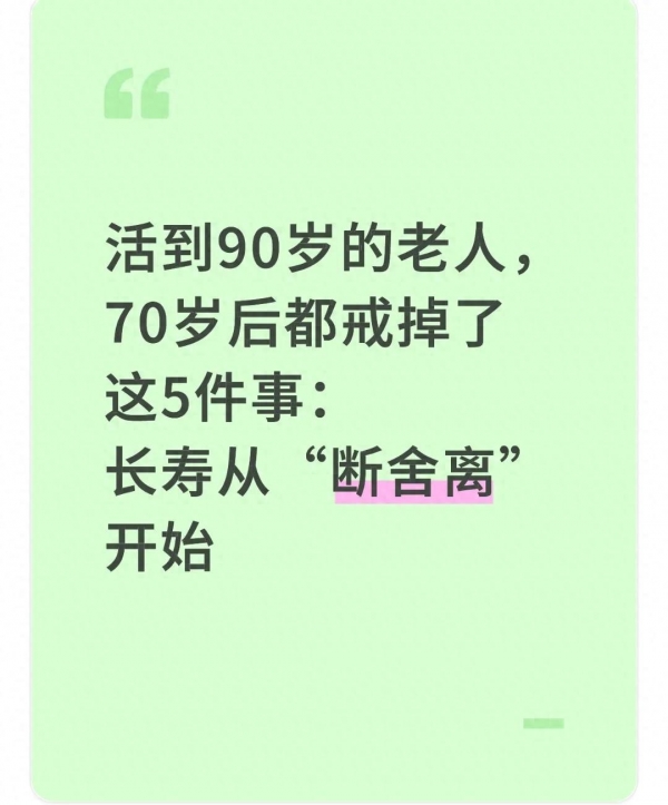 活到90岁的老人,不是天生体质好,而是在70岁这个"人生分水岭"上,做对了选择--他们早早戒掉了那些消耗身体、内耗情绪的事,把日子过得清淡、从容、有分寸。今天就用大白话,结合身边长寿老人的真实案例,说说70岁后一定要戒掉的5件事,读懂了,或许能给你的晚年生活添一份健康底气。