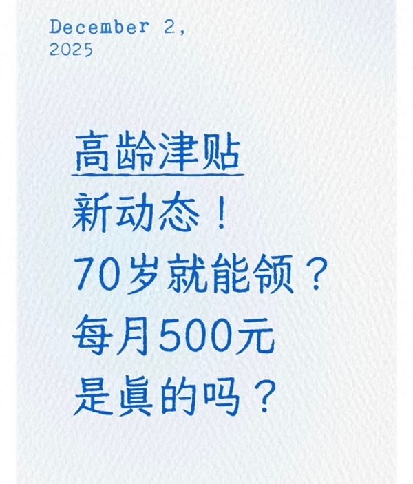 家里有高龄老人的注意了!最近高龄津贴又传新消息,不少人听说"70岁就能领""每月能拿500元",甚至还有人说申领流程简化了,不用跑腿就能领钱。这些说法到底是真的吗?高龄津贴的起领年龄、发放标准到底怎么定?今天就用最实在的大白话,把这些大家关心的问题一次性说透,不管是帮自家老人咨询,还是给亲友转告,都能看得明明白白,不踩坑、不漏领。