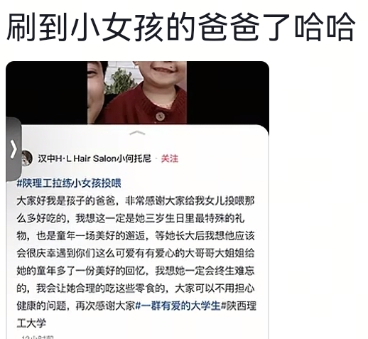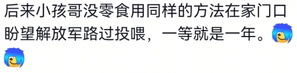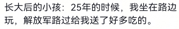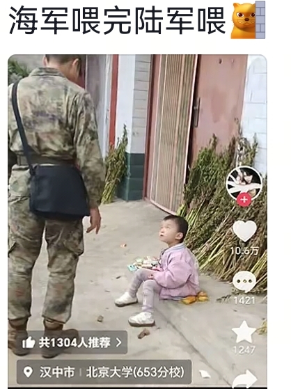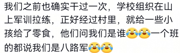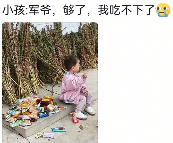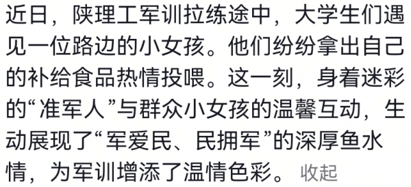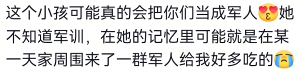 看到一个帖子,小女孩被过路拉练的大学生投喂,每个军训的连队经过她身边都送上小零食,"同学们都很有善意 看的心里暖暖的"