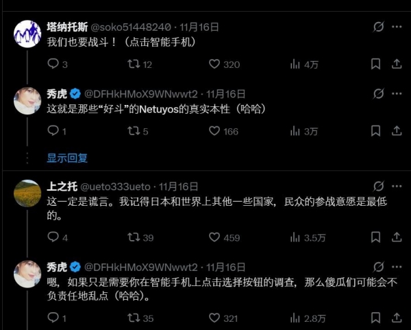 实际上,日本国内的有识之士也对右翼的虚伪看得很清楚,直言他们对于战争的支持只限于"敲击手机屏幕",一旦真打起来的话,一个比一个跑得更快,还有日本民众调侃右翼是墙头草,称真和中国开战之后,可能很多"同胞"会直接加入中国军队战斗。