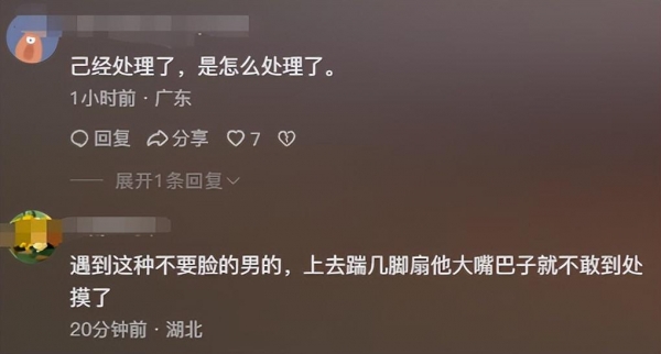 更可恨的是,老头年纪一大把了还干这么下流猥琐的勾当,堂而皇之占年轻姑娘的便宜。真是为老不尊,衰败得很啊!希望当地有关部门严肃查处此事,绝不姑息养奸。同时我也呼吁广大女性遇到这类事要敢于发声,用法律武器保护自己!