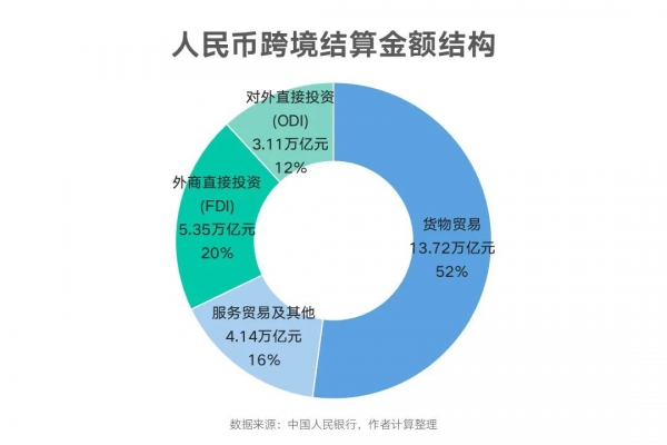 进入主题前,我们先看两张数据图表。人民币跨境结算金额的结构通常包括经常项下和直接投资两大类。目前,经常项下结算占比达到了总规模的67.9%,金额为17.86万亿元(见下图)。货物贸易仍在经常项下占主导地位,占比达52.1%,金额为13.72万亿元;与此同时,服务贸易及其他经常项目的占比正呈现出稳步上升的态势,目前已占总规模的15.7%,金额为4.14万亿元。
