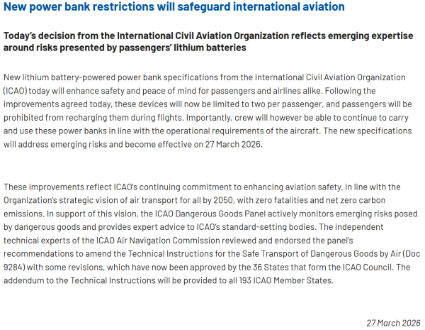 国际民航组织在声明中表示,新规旨在应对新出现的安全风险,将于27日生效。根据新规,机组人员仍可根据飞机操作需求,继续携带并使用充电宝。